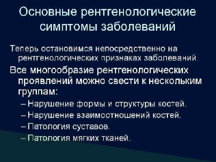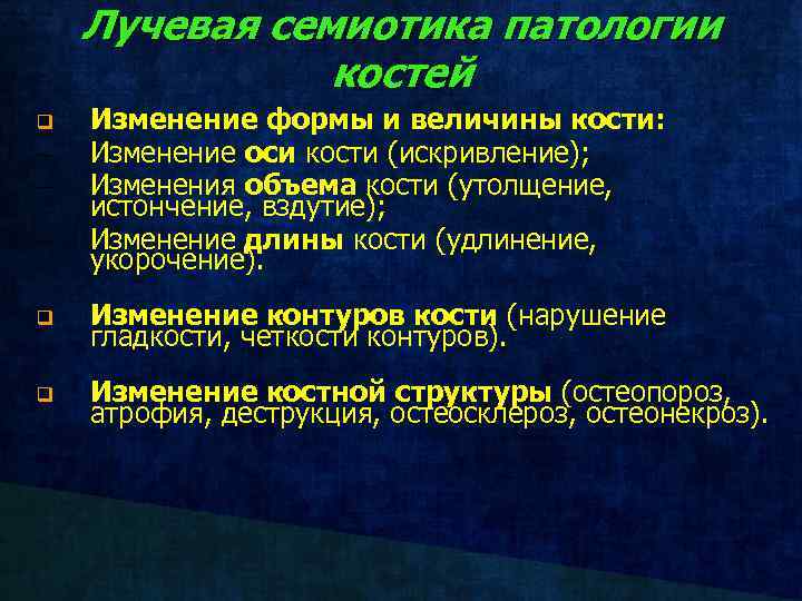 Лучевая семиотика патологии костей q Изменение формы и величины кости: Изменение оси кости (искривление); Изменения объема кости (утолщение, истончение, вздутие); Изменение длины кости (удлинение, укорочение). q Изменение контуров кости (нарушение гладкости, четкости контуров). q Изменение костной структуры (остеопороз, атрофия, деструкция, остеосклероз, остеонекроз).