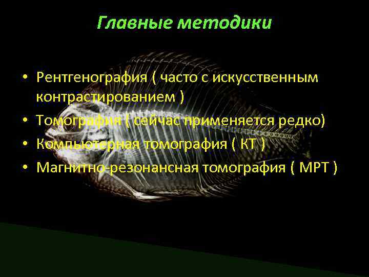 Главные методики • Рентгенография ( часто с искусственным контрастированием ) • Томография ( сейчас применяется редко) • Компьютерная томография ( КТ ) • Магнитно-резонансная томография ( МРТ )