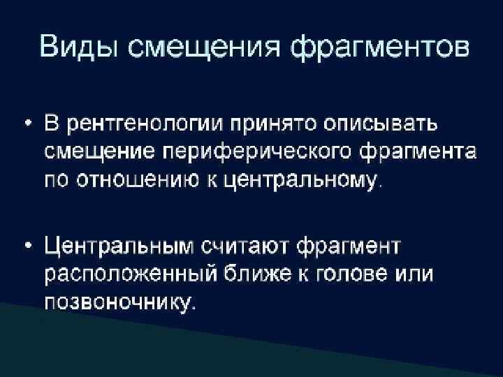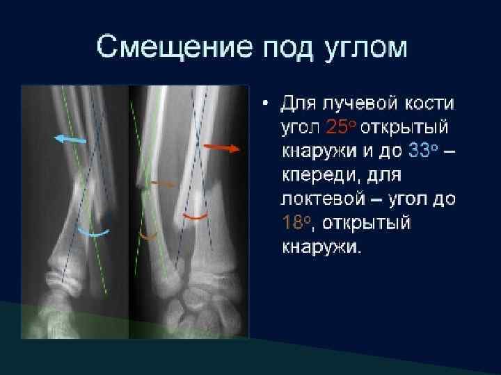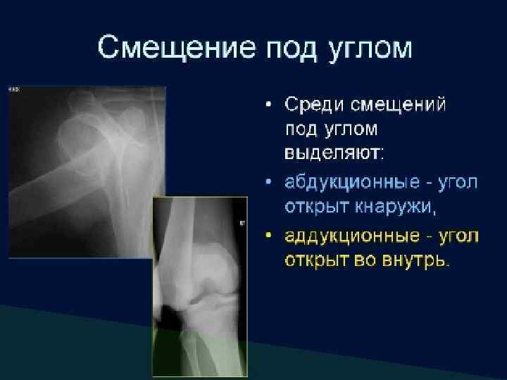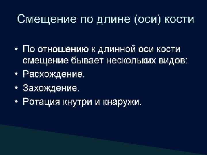 Изменение оси кости Направление отклонения оси определяют по дистальным отделам кости Смещение кнаружи (вальгусная деформация) Смещение кпереди (антерокурвация) Смещение кнутри (варусная деформация) Смещение кзади (рекурвация)