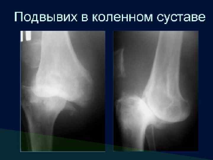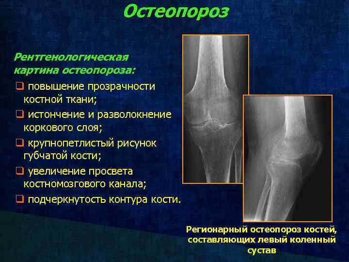 Остеопороз Рентгенологическая картина остеопороза: q повышение прозрачности костной ткани; q истончение и разволокнение коркового слоя; q крупнопетлистый рисунок губчатой кости; q увеличение просвета костномозгового канала; q подчеркнутость контура кости. Регионарный остеопороз костей, составляющих левый коленный сустав