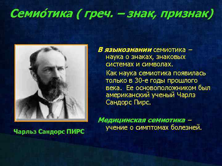 Семио тика ( греч. – знак, признак) В языкознании семиотика – наука о знаках, знаковых системах и символах. Как наука семиотика появилась только в 30 -е годы прошлого века. Ее основоположником был американский ученый Чарлз Сандорс Пирс. Медицинская семиотика – Чарльз Сандорс ПИРС учение о симптомах болезней.