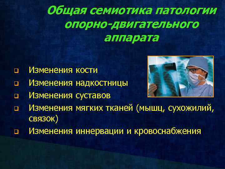 Общая семиотика патологии опорно-двигательного аппарата q q q Изменения связок) Изменения кости надкостницы суставов мягких тканей (мышц, сухожилий, иннервации и кровоснабжения