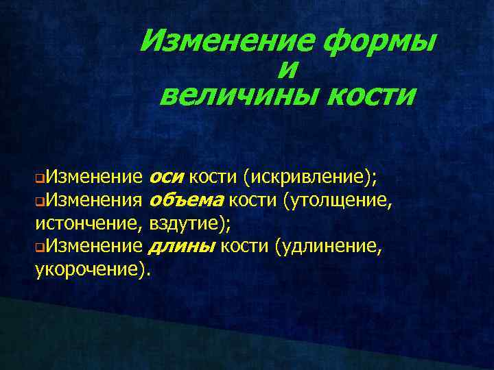 Изменение формы и величины кости Изменение оси кости (искривление); q. Изменения объема кости (утолщение, истончение, вздутие); q. Изменение длины кости (удлинение, укорочение). q