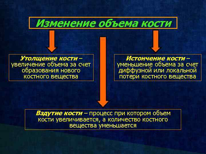 Изменение объема кости Утолщение кости – увеличение объема за счет образования нового костного вещества Истончение кости – уменьшение объема за счет диффузной или локальной потери костного вещества Вздутие кости – процесс при котором объем кости увеличивается, а количество костного вещества уменьшается