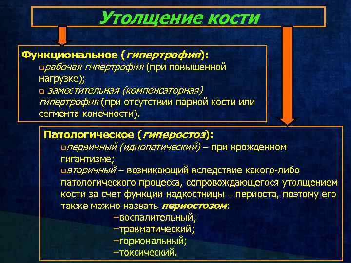 Утолщение кости Функциональное (гипертрофия): qрабочая гипертрофия (при повышенной нагрузке); заместительная (компенсаторная) гипертрофия (при отсутствии парной кости или q сегмента конечности). Патологическое (гиперостоз): qпервичный (идиопатический) при врожденном гигантизме; вторичный возникающий вследствие какого-либо q патологического процесса, сопровождающегося утолщением кости за счет функции надкостницы периоста, поэтому его также можно назвать периостозом: –воспалительный; –травматический; –гормональный; –токсический.
