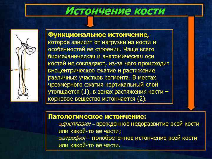 Истончение кости Функциональное истончение, которое зависит от нагрузки на кости и особенностей ее строения. Чаще всего биомеханическая и анатомическая оси костей не совпадают, из-за чего происходит внецентрическое сжатие и растяжение различных участков сегмента. В местах чрезмерного сжатия кортикальный слой утолщается (1), в зонах растяжения кости – корковое вещество истончается (2). Патологическое истончение: qдисплазии врожденное недоразвитие всей кости или какой-то ее части; qатрофия приобретенное истончение всей кости или какой-то ее части.
