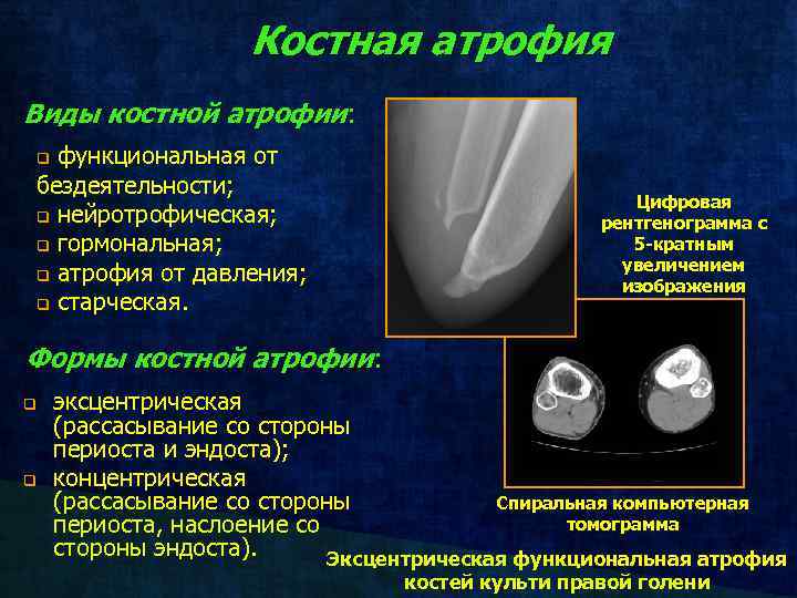 Костная атрофия Виды костной атрофии: функциональная от бездеятельности; q нейротрофическая; q гормональная; q атрофия от давления; q старческая. q Цифровая рентгенограмма с 5 -кратным увеличением изображения Формы костной атрофии: q q эксцентрическая (рассасывание со стороны периоста и эндоста); концентрическая Спиральная компьютерная (рассасывание со стороны томограмма периоста, наслоение со стороны эндоста). Эксцентрическая функциональная атрофия костей культи правой голени
