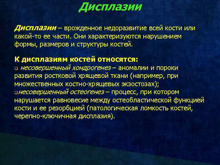 Дисплазии врожденное недоразвитие всей кости или какой-то ее части. Они характеризуются нарушением формы, размеров и структуры костей. К дисплазиям костей относятся: q несовершенный хондрогенез – аномалии и пороки развития ростковой хрящевой ткани (например, при множественных костно-хрящевых экзостозах); qнесовершенный остеогенез – процесс, при котором нарушается равновесие между остеобластической функцией кости и ее резорбцией (патологическая ломкость костей, черепно-ключичная дисплазия).