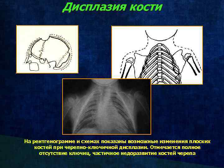 Дисплазия кости На рентгенограмме и схемах показаны возможные изменения плоских костей при черепно-ключичной дисплазии. Отмечается полное отсутствие ключиц, частичное недоразвитие костей черепа
