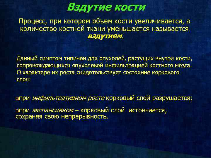 Вздутие кости Процесс, при котором объем кости увеличивается, а количество костной ткани уменьшается называется вздутием. Данный симптом типичен для опухолей, растущих внутри кости, сопровождающихся опухолевой инфильтрацией костного мозга. О характере их роста свидетельствует состояние коркового слоя: q при инфильтративном росте корковый слой разрушается; при экспансивном – корковый слой истончается, сохраняя свою непрерывность. q