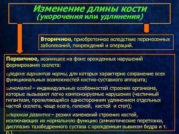 Изменение длины кости (укорочения или удлинения) Вторичное, приобретенное вследствие перенесенных заболеваний, повреждений и операций. Первичное, возникшее на фоне врожденных нарушений формирования скелета: редких вариантов нормы, для которых характерно сохранение всех q функциональных возможностей костно-суставного аппарата; аномалий – индивидуальных особенностей строения организма, q которые вызывают легко компенсируемые нарушения (частичный гигантизм, проявляющийся односторонним удлинением отдельных частей скелета, чаще всего, голеней, кистей и стоп); пороков развития – резких изменений строения костей, q исключающих их нормальную функцию (амниотические перетяжки, дисплазия тазобедренного сустава с врожденным вывихом бедра и т.