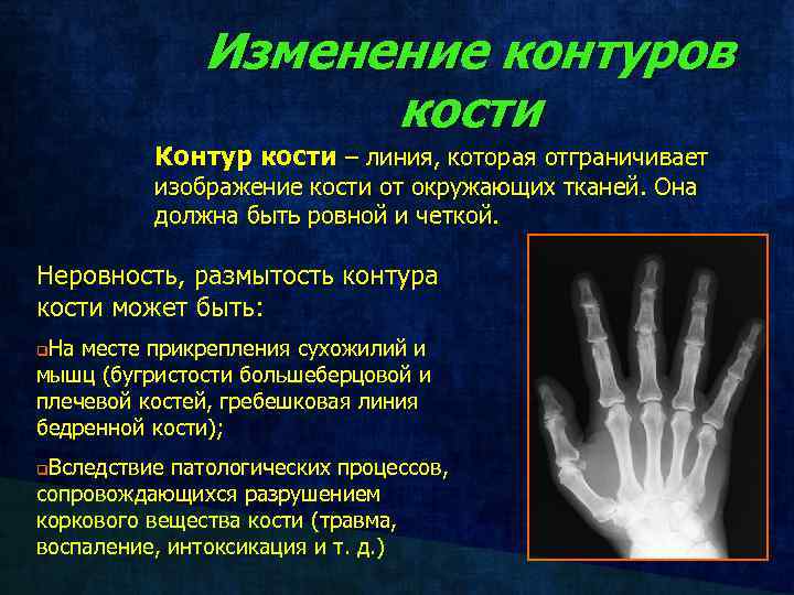 Изменение контуров кости Контур кости – линия, которая отграничивает изображение кости от окружающих тканей. Она должна быть ровной и четкой. Неровность, размытость контура кости может быть: На месте прикрепления сухожилий и мышц (бугристости большеберцовой и плечевой костей, гребешковая линия бедренной кости); q Вследствие патологических процессов, сопровождающихся разрушением коркового вещества кости (травма, воспаление, интоксикация и т. д. ) q