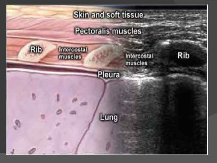 Норма УЗИ легких гипоэхогенный слой жировой клетчатки (подкожной) эхогенная полоска внешней фасции груди слои мышц (гипоэхогенные) эхогенная полоска внутренней фасции груди гипогенный слой рыхлой клетчатки эхогенная полоска толщиной 1 мм (граница мягких тканей и воздушной легочной тканью) легочная ткань.