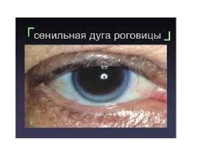 • Ксантомы, ксантелазмы, сенильная дуга. Внешними признаками атеросклеротического процесса могут быть ксантомы (бугристые образования в области суставов, пяточных сухожилий, обусловленные отложением холестерина), ксантелазмы (различной формы пятна на коже желтовато оранжевого цвета, часто возвышающиеся, обусловленные отложением в коже холестерина и триглицеридов) и сенильная дуга на роговице (полоска желтоватого цвета по краю роговицы)