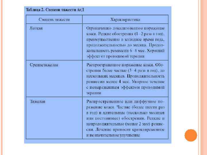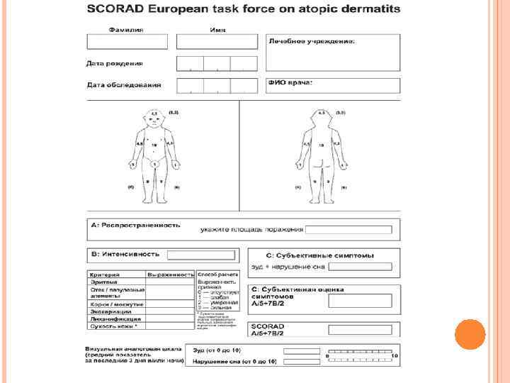 В практической деятельности принято выделять атопический дерматит легкой, средней и тяжелой степени, однако для объективной оценки степени тяжести кожного процесса и динамики течения заболевания в 1994 г. Европейской рабочей группой по АД предложена шкала SCORAD (scoring atopic dermatitis)). Она разрабатывалась совместно с врачами и пациентами, страдавшими Атоп Дер, и объединяет объективные (интенсивность и распространенность кожного поражения) и субъективные (интенсивность дневного кожного зуда и нарушение сна) критерии. Основным преимуществом использования шкалы SCORAD является возможность сравнительного анализа полученных результатов с помощью компьютерной обработки, а также объективная оценка эффективности различных методов терапии. SCORAD предусматривает балльную оценку шести объективных симптомов: эритема, отек/папулезные элементы, корки/мокнутие, экскориации, лихенификация/шелушение, сухость кожи. Интенсивность каждого признака оценивается по 4 -уровневой шкале: 0 — отсутствие, 1 — слабая, 2 — умеренная, 3 — сильная. Расчет индекса SCORAD производится по формуле: SCORAD = А/5+7 В/2+С, где: А — распространенность поражения кожи, В — сумма уровней интенсивности клинических симптомов АД, С — сумма оценок субъективных нарушений по визуальной аналоговой шкале. Значения индекса могут варьировать в пределах от 0 (нет заболевания) до 103 (максимально тяжелое течение АД). На линейке внизу рисунка указывается точка, соответствующая степени выраженности оцениваемого субъективного признака, усредненное за последние 3 суток.