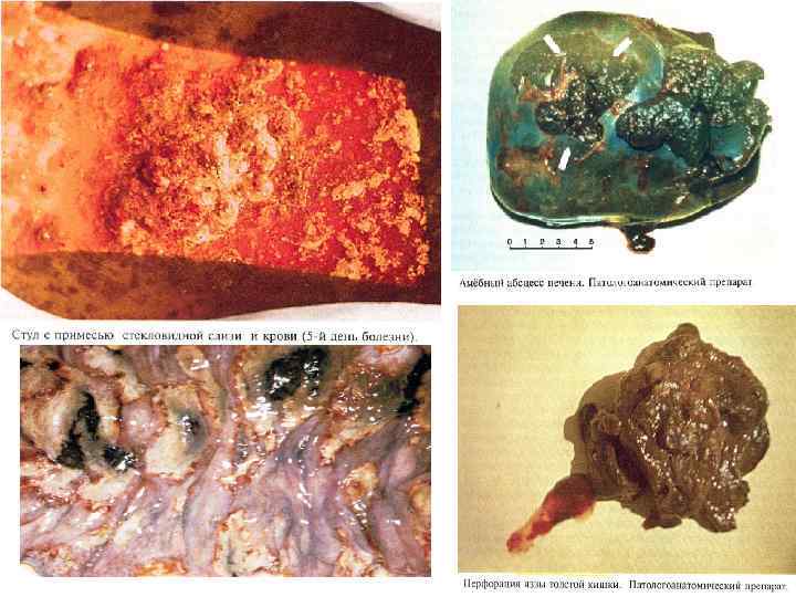 КИШЕЧНЫЙ АМЕБИАЗ 1. Прикрепление амеб к клеткам-мишеням. (Поражаются: а) слепая и восходящая к. к. б) прямая, сигмовидная и ободочная к. к. в) аппендикс и терминальные участки подвздошной к. ) 2. Разрушение слизистой оболочки кишки. 3. Проникновение амеб в подслизистый слой. 4. Экссудация. Тромбоз капилляров, инфильтрация. 5. Некроз тканей. 6. Образование узелка, заполненного детритом, амебами, жидкостью. 7. Прорыв узелка. 8. Формирование язв (от микроскопических до неск. см) 9. Образование синусов. 10. Формирование язв с поражением мышечного и серозного слоев.