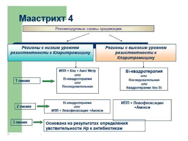 Трехкомпонентная терапия: • Омепразол по 20 мг (или лансопразол 30 мг, или эзомепразол 20 мг) + кларитромицин 7, 5 мг/кг(max-500 мг) + амоксициллин 2030 мг/кг (max 1000 мг) или метронидазол 40 мг/кг (max 500 мг); • Соблюдение терапии и побочные эффекты должны контролироваться.
