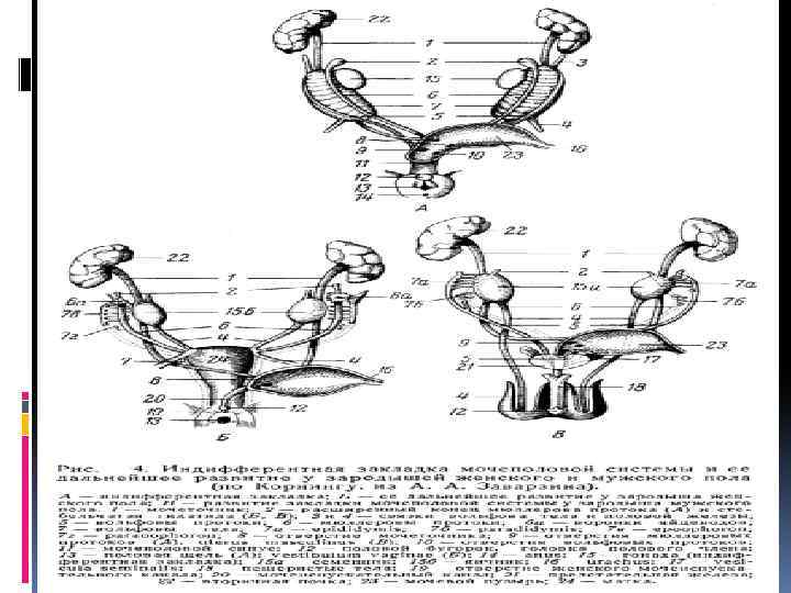 Источники и ход эмбрионального развития мужской половой системы Ранняя стадия протекает одинаково для обоих полов – индифферентная стадия (до 5 нед. ). На 3 нед. эмбриогенеза в стенке желточного мешка из мезенхимы закладываются первичные половые клетки – гонобласты. На 4 нед. эмбриогенеза на поверхности первичных почек происходит размножение клеток целомического эпителия и образование половых валиков. Гонобласты по сосудам иммигрируют в половые валики и в них идет пролиферация гонобластов и эпителиальных клеток. Одновременно (4 -5 нед. ) от мезонефрального протока отщепляется парамезонефральный проток. В позднюю дифференцировку системы (с 6 -ой недели эмбриогенеза) в развивающемся яичке вырабатывается гормон – ингибин, который вырабатывает атрофию парамезонефрального протока. Из его нижней части развивается предстательная (мужская) маточка. Из мезонефрального протока образуются семявыводящие пути. На 8 -10 нед. начинается выработка тестостерона. В половых тяжах продолжается пролиферация гонобластов, из которых образуется сперматогенный эпителий. В конечном итоге из половых тяжей образуются извитые семенные канальцы, прямые семенные канальцы и канальцы сети семенника. Из канальцев первичной почки образуются выносящие канальцы, которые формируют головку придатка. Из сети мочеполового синуса формируются семенные пузырьки и предстательная железа.