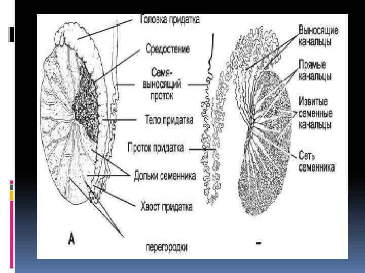Мужская половая железа – яичко. Снаружи имеет плотную соединительнотканную капсулу белочную оболочку, которая образует средостение, от выпуклой части которого идут соединительнотканные перегородки, которые делят железу на дольки (до 250). В дольке располагается от 1 до 4 извитых семенных канальцев. Между петлями канальцев лежат очень тонкие прослойки рыхлой соединительной ткани, которые содержат кровеносные капилляры и интерстициальные клетки. Стенка извитого канальца содержит поддерживающие клетки и сперматогенный эпителий. Поддерживающие клетки широким основанием располагаются на базальной мембране. Между ними располагается сперматогенный эпителий, в нем идет сперматогенез – это процесс образования сперматозоидов