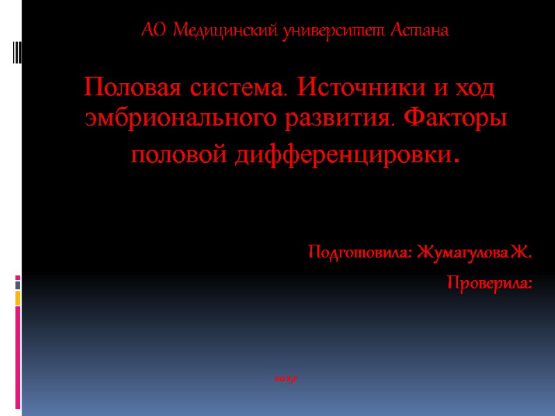АО Медицинский университет Астана Половая система. Источники и ход эмбрионального развития. Факторы половой дифференцировки. Подготовила: Жумагулова Ж. Проверила: 2015г