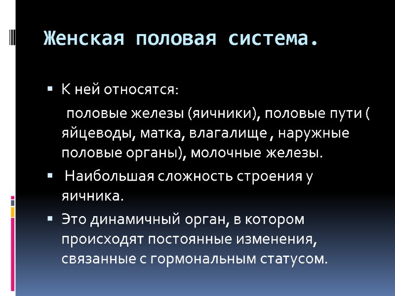Женская половая система. К ней относятся: половые железы (яичники), половые пути ( яйцеводы, матка, влагалище , наружные половые органы), молочные железы. Наибольшая сложность строения у яичника. Это динамичный орган, в котором происходят постоянные изменения, связанные с гормональным статусом.