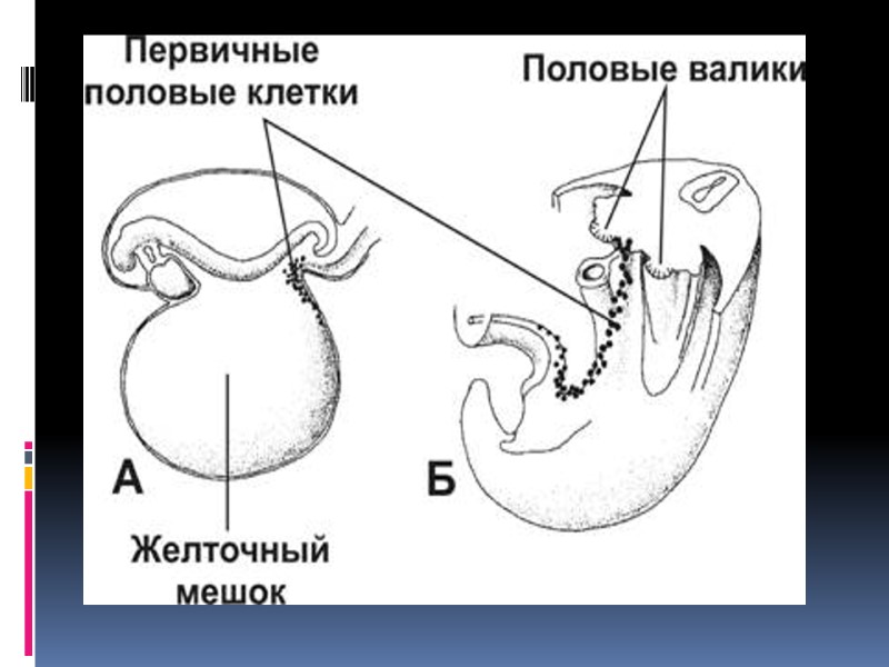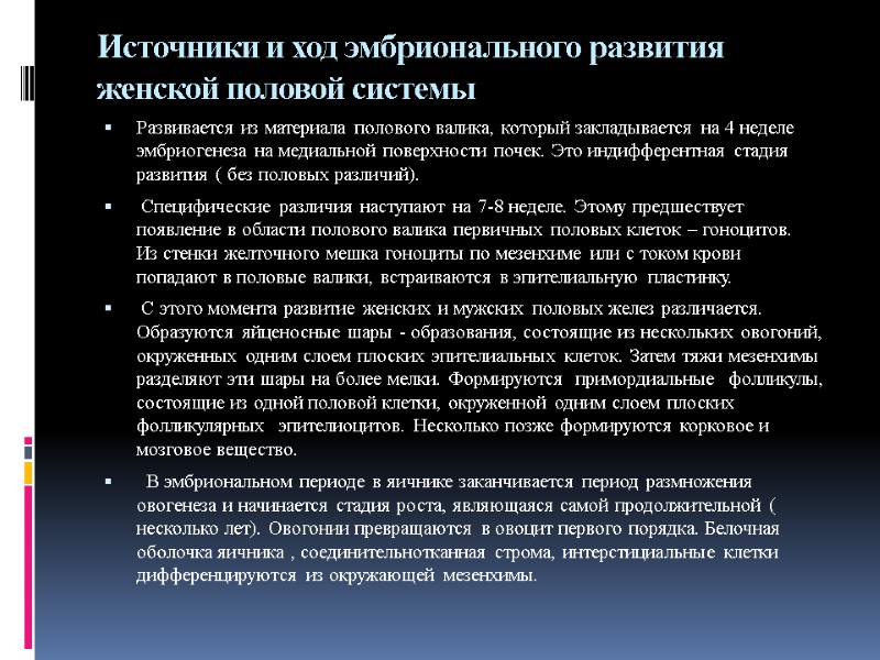 Источники и ход эмбрионального развития женской половой системы Развивается из материала полового валика, который закладывается на 4 неделе эмбриогенеза на медиальной поверхности почек. Это индифферентная стадия развития ( без половых различий). Специфические различия наступают на 7-8 неделе. Этому предшествует появление в области полового валика первичных половых клеток – гоноцитов. Из стенки желточного мешка гоноциты по мезенхиме или с током крови попадают в половые валики, встраиваются в эпителиальную пластинку. С этого момента развитие женских и мужских половых желез различается. Образуются яйценосные шары - образования, состоящие из нескольких овогоний, окруженных одним слоем плоских эпителиальных клеток. Затем тяжи мезенхимы разделяют эти шары на более мелки. Формируются примордиальные фолликулы, состоящие из одной половой клетки, окруженной одним слоем плоских фолликулярных эпителиоцитов. Несколько позже формируются корковое и мозговое вещество. В эмбриональном периоде в яичнике заканчивается период размножения овогенеза и начинается стадия роста, являющаяся самой продолжительной ( несколько лет). Овогонии превращаются в овоцит первого порядка. Белочная оболочка яичника , соединительнотканная строма, интерстициальные клетки дифференцируются из окружающей мезенхимы.