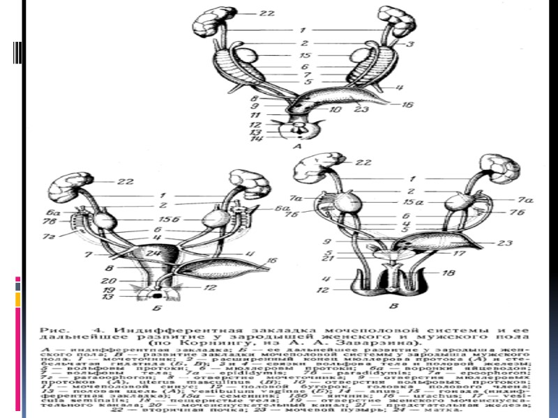 Источники и ход эмбрионального развития мужской половой системы Ранняя стадия протекает одинаково для обоих полов – индифферентная стадия (до 5 нед.). На 3 нед. эмбриогенеза в стенке желточного мешка из мезенхимы закладываются первичные половые клетки – гонобласты. На 4 нед. эмбриогенеза на поверхности первичных почек происходит размножение клеток целомического эпителия и образование половых валиков. Гонобласты по сосудам иммигрируют в половые валики и в них идет пролиферация гонобластов и эпителиальных клеток. Одновременно (4-5 нед.) от мезонефрального протока отщепляется парамезонефральный проток. В позднюю дифференцировку системы (с 6-ой недели эмбриогенеза) в развивающемся яичке вырабатывается гормон – ингибин, который вырабатывает атрофию парамезонефрального протока. Из его нижней части развивается предстательная (мужская) маточка. Из мезонефрального протока образуются семявыводящие пути. На 8-10 нед. начинается выработка тестостерона. В половых тяжах продолжается пролиферация гонобластов, из которых образуется сперматогенный эпителий . В конечном итоге из половых тяжей образуются извитые семенные канальцы, прямые семенные канальцы и канальцы сети семенника. Из канальцев первичной почки образуются выносящие канальцы, которые формируют головку придатка. Из сети мочеполового синуса формируются семенные пузырьки и предстательная железа.