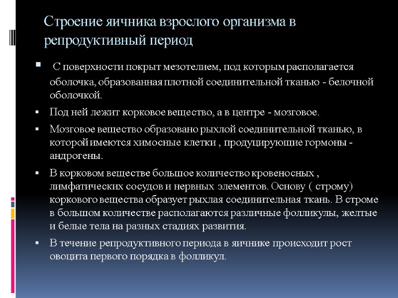 Строение яичника взрослого организма в репродуктивный период С поверхности покрыт мезотелием, под которым располагается оболочка, образованная плотной соединительной тканью - белочной оболочкой. Под ней лежит корковое вещество, а в центре - мозговое. Мозговое вещество образовано рыхлой соединительной тканью, в которой имеются химосные клетки , продуцирующие гормоны - андрогены. В корковом веществе большое количество кровеносных , лимфатических сосудов и нервных элементов. Основу ( строму) коркового вещества образует рыхлая соединительная ткань. В строме в большом количестве располагаются различные фолликулы, желтые и белые тела на разных стадиях развития. В течение репродуктивного периода в яичнике происходит рост овоцита первого порядка в фолликул.