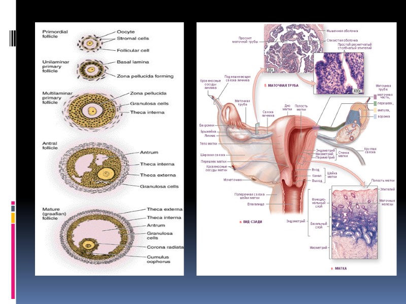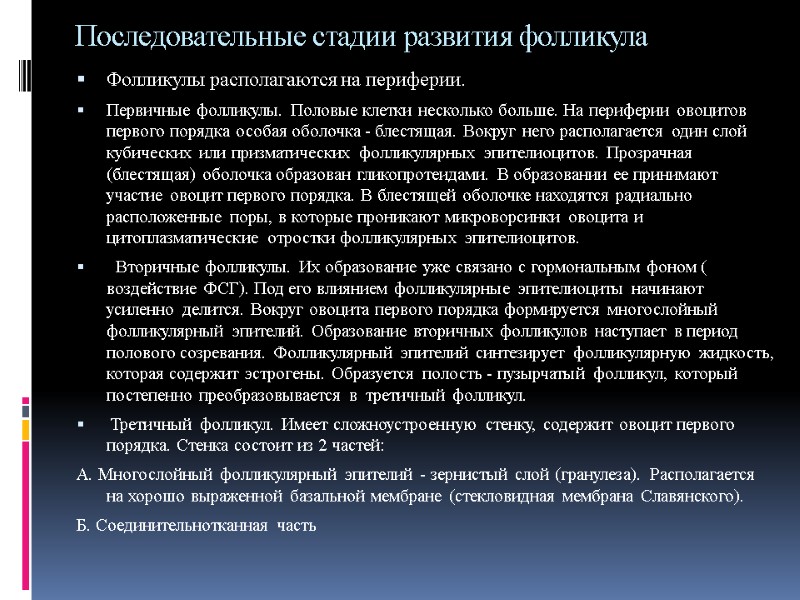 Последовательные стадии развития фолликула Фолликулы располагаются на периферии. Первичные фолликулы. Половые клетки несколько больше. На периферии овоцитов первого порядка особая оболочка - блестящая. Вокруг него располагается один слой кубических или призматических фолликулярных эпителиоцитов. Прозрачная (блестящая) оболочка образован гликопротеидами. В образовании ее принимают участие овоцит первого порядка. В блестящей оболочке находятся радиально расположенные поры, в которые проникают микроворсинки овоцита и цитоплазматические отростки фолликулярных эпителиоцитов. Вторичные фолликулы. Их образование уже связано с гормональным фоном ( воздействие ФСГ). Под его влиянием фолликулярные эпителиоциты начинают усиленно делится. Вокруг овоцита первого порядка формируется многослойный фолликулярный эпителий. Образование вторичных фолликулов наступает в период полового созревания. Фолликулярный эпителий синтезирует фолликулярную жидкость, которая содержит эстрогены. Образуется полость - пузырчатый фолликул, который постепенно преобразовывается в третичный фолликул. Третичный фолликул. Имеет сложноустроенную стенку, содержит овоцит первого порядка. Стенка состоит из 2 частей: А. Многослойный фолликулярный эпителий - зернистый слой (гранулеза). Располагается на хорошо выраженной базальной мембране (стекловидная мембрана Славянского). Б. Соединительнотканная часть