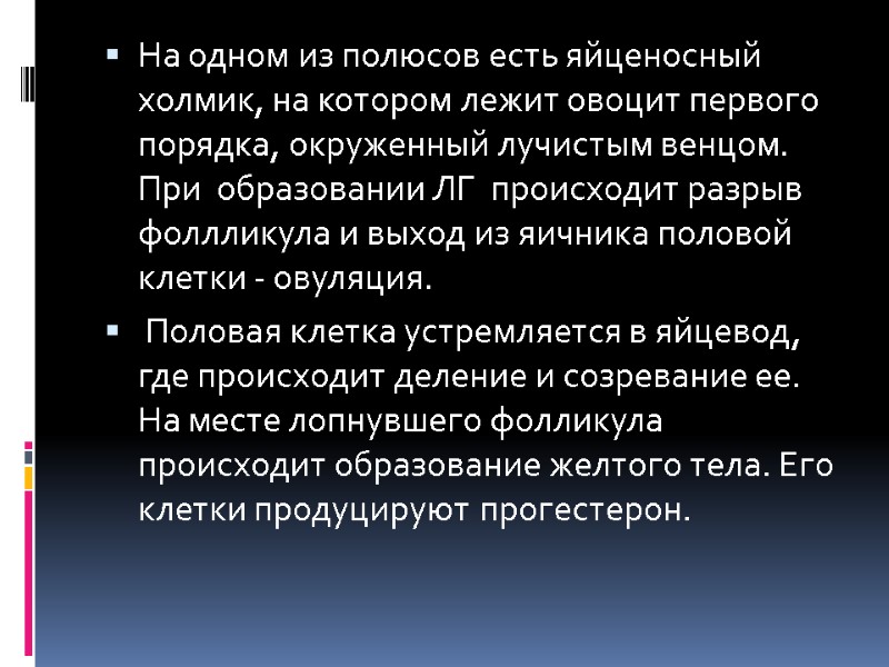 На одном из полюсов есть яйценосный холмик, на котором лежит овоцит первого порядка, окруженный лучистым венцом. При образовании ЛГ происходит разрыв фоллликула и выход из яичника половой клетки - овуляция. Половая клетка устремляется в яйцевод, где происходит деление и созревание ее. На месте лопнувшего фолликула происходит образование желтого тела. Его клетки продуцируют прогестерон.