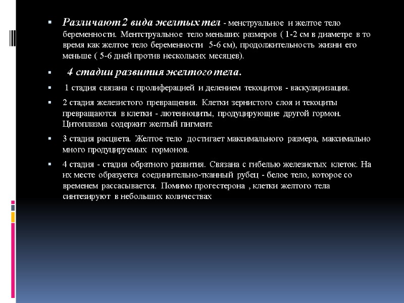 Различают 2 вида желтых тел - менструальное и желтое тело беременности. Ментструальное тело меньших размеров ( 1-2 см в диаметре в то время как желтое тело беременности 5-6 см), продолжительность жизни его меньше ( 5-6 дней против нескольких месяцев). 4 стадии развития желтого тела. 1 стадия связана с пролиферацией и делением текоцитов - васкуляризация. 2 стадия железистого превращения. Клетки зернистого слоя и текоциты превращаются в клетки - лютеиноциты, продуцирующие другой гормон. Цитоплазма содержит желтый пигмент. 3 стадия расцвета. Желтое тело достигает максимального размера, максимально много продуцируемых гормонов. 4 стадия - стадия обратного развития. Связана с гибелью железистых клеток. На их месте образуется соединительно-тканный рубец - белое тело, которое со временем рассасывается. Помимо прогестерона , клетки желтого тела синтезируют в небольших количествах