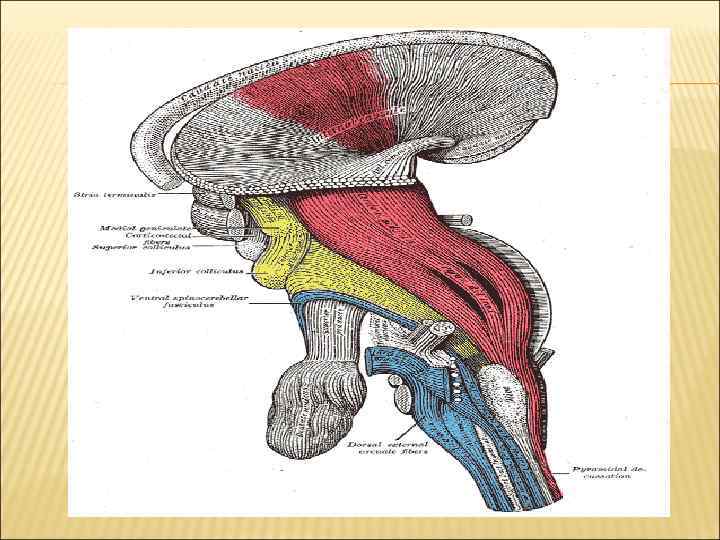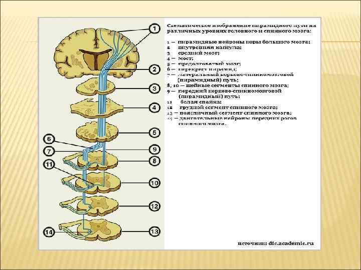 Когда волокна пирамидного пути покидают двигательную область коры, они, проходя через лучистый венец белого вещества мозга, сходятся по направлению к задней ножке внутренней капсулы. В соматотопическом порядке они проходят внутреннюю капсулу (ее колено и передние две трети заднего бедра) и идут в средней части ножек мозга, нисходят через каждую половину основания моста. На уровне понтомедуллярного сочленения пирамидный путь становится видимым извне, его волокна образуют удлиненные пирамиды по обе стороны от средней линии продолговатого мозга (отсюда его название). В нижней части продолговатого мозга 80– 85 % волокон каждого пирамидного пути переходят на противоположную сторону в перекресте пирамид и образуют латеральный пирамидный путь. Остальные волокна продолжают спускаться неперекрещенными в передних канатиках в качестве переднего пирамидного пути. Эти волокна перекрещиваются на сегментарном уровне через переднюю комиссуру спинного мозга.