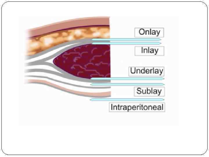 Методы пластики брюшной стенки I. Аутопластика. Фасциально-апоневротическая. Мышечно-апоневротическая. II. Аллопластика - эксплантация: «натяжная» и «ненатяжная» - с использованием аутодермальных трансплантатов, твердой мозговой оболочки, синтетических тканей (полиэстер, полипропилен, политетрафторэтилен и т. д. ). III. Комбинированная герниопластика. В основе этого метода лежит использование собственных тканей больного (рубцовые ткани, лоскуты грыжевого мешка, большой сальник) в комбинации с эксплантатами, с их размещением по принципам onlay, inlay, sublay, onlay+inlay. Пластику передней брюшной стенки, когда наряду с устранением грыжевого дефекта осуществляют сопоставление и послойную адаптацию его краев и восстанавливают нормальное топографо-анатомическое строение, называют радикальной ( «натяжная пластика» ). Пластику передней брюшной стенки без сближения краев грыжевого дефекта, при отсутствии условий для выполнения радикальной операции или высоком риске возникновения бронхо-легочных или сердечно-сосудис