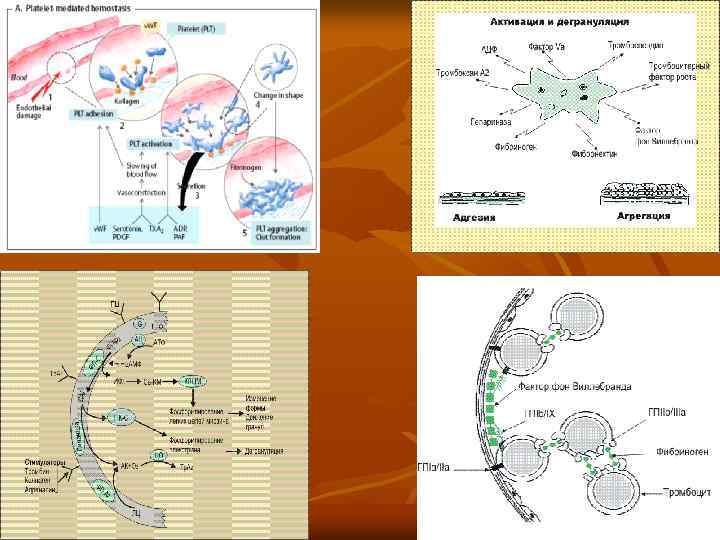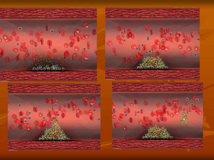 Этапы сосудистотромбоцитарного гемостаза n 1. Кратковременный спазм сосудов. 2. Адгезия тромбоцитов (прилипание тромбоцитов к сосудистой стенке). 3. Агрегация тромбоцитов: а) обратная агрегация (образуется неплотный тромбоцитарный сгусток, через который проходит плазма крови); б) необратимая агрегация (образуется плотный гомогенный тромбоцитарный сгусток, который не пропускает плазму крови). 4. Ретракция тромбоцитарного тромба.