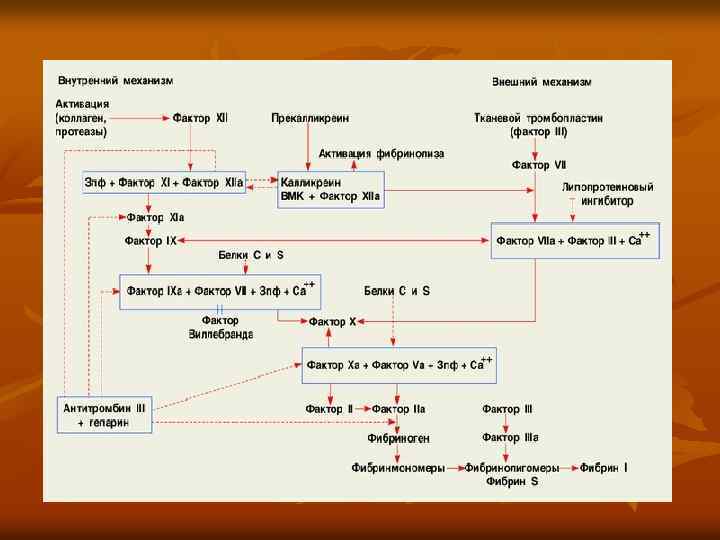 Фазы коагуляционного гемостаза. n Активация протромбиназы (образование тромбиназы, а точнее тромбиназного комплекса) – фаза 1. Есть 2 разных механизма активации протромбиназы. Один - „внешний механизм”, запускается поступлением из тканей в плазму тканевого тромбопластин. Тканевой тромбопластин (фактор ІІІ) взаимодействует с VII фактором и активирует его. Фактор ІІІ, активный VII и ионы Са 2+ образуют комплекс: VII а + ІІІ + Са 2+. Он активирует фактор Х.