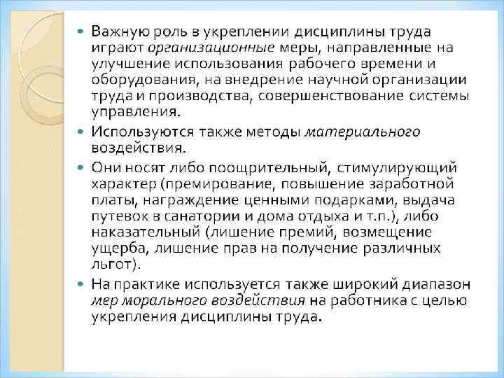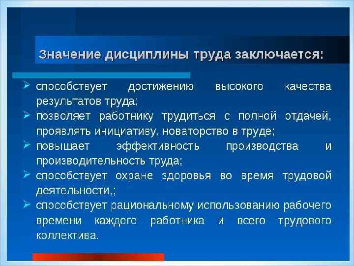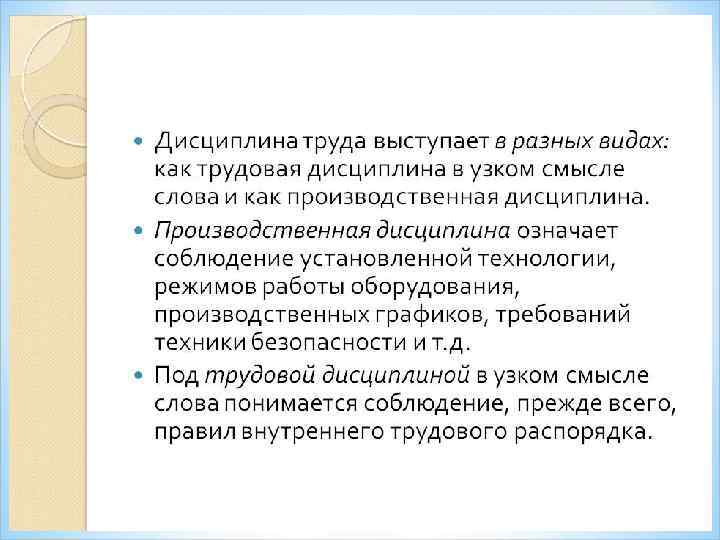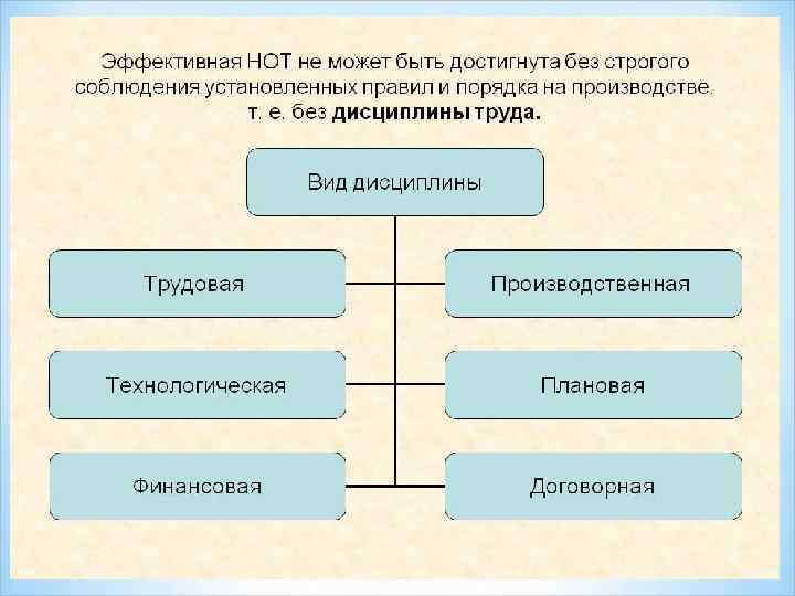 Дисциплина труда может быть разграничена на технологическую и производственную дисциплину. Технологическая дисциплина работников заключается в соблюдении технических правил на производстве и представляющую часть их трудовой дисциплины. Ее нарушение дает основание для применения дисциплинарной ответственности и лишения премии. Производственная дисциплина представляет собой порядок на производстве. Производственная дисциплина означает порядок на произ водстве. По своему содержанию она охватывает: = тру довую дисциплинуи выходит за ее пределы; = обеспечение четкой и ритмичной работы организации; = обеспечение работающих сырьем, инстру ментами, материалами, работой без простоев и т. д.