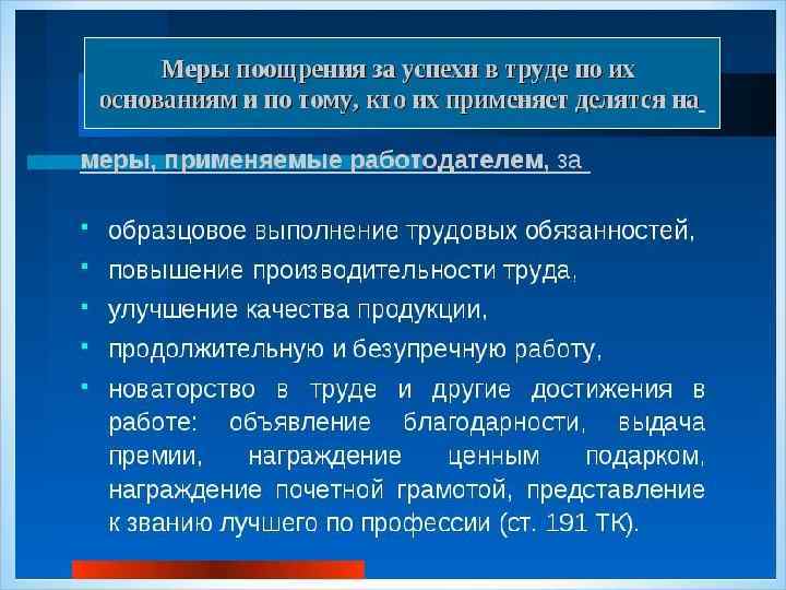 Меры морального и материального стимулирования имеют целью обеспечение должной трудовой дисциплины, укрепление организованности и порядка. Целью поощрения является стимулирование как отличившегося работника, так и других на его примере. В правовом смысле поощрением следует понимать публичное признание трудовых заслуг и оказание почета как отдельному работнику, так и коллективу в форме установленных трудовым законодательством и локальными нормативными актами мер поощрения. Меры поощрения носят правовой характер, поскольку установлены или санкционированы органами власти. Поощрения оформляются приказом или распоряжением руководителя организации, который доводится до всех работников и сведения о нем заносятся в трудовую книжку работника. Для каждого вида поощрений существует определенный порядок его применения, который определен в нормативном акте, которым устанавливается конкретный вид поощрения: представление, подготовка нормативного акта о поощрении (Указ, приказ, распоряжение) и собственно поощрение–награждение.