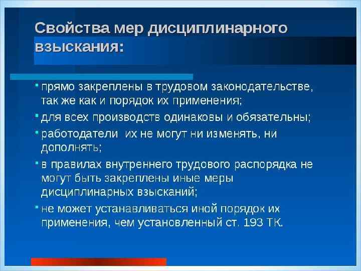 Правовое понятие "дисциплинарная ответственность работника" состоит из трех юридически значимых обстоятельства: 1) совершения работником дисциплинарного проступка; 2) наличия у полномочного представителя работодателя права применить предусмотренные законодательством меры дисциплинарного взыскания; 3) наличия обязанности работника претерпеть установленные законодательством за совершение дисциплинарного проступка неблагоприятные последствия. При этом содержание дисциплинарной ответственности составляют предусмотренные в законодательстве меры дисциплинарных взысканий, которые и выступают в качестве применяемых к работнику санкций за совершение дисциплинарного проступка.