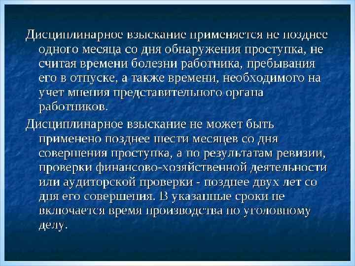 Сроки применения дисциплинарного взыскания (считаются со дня совершения дисциплинарного проступка) не позднее одного месяца В этот период не включаются: время болезни работника, время пребывания его в отпуске, а также время, необходимое на учет мнения представительного органа работников. С учетом этим фактов – не позднее шести месяцев не позднее двух лет Если дисциплинарный проступок обнаружен в результате ревизии или финансово хозяйственной проверки.