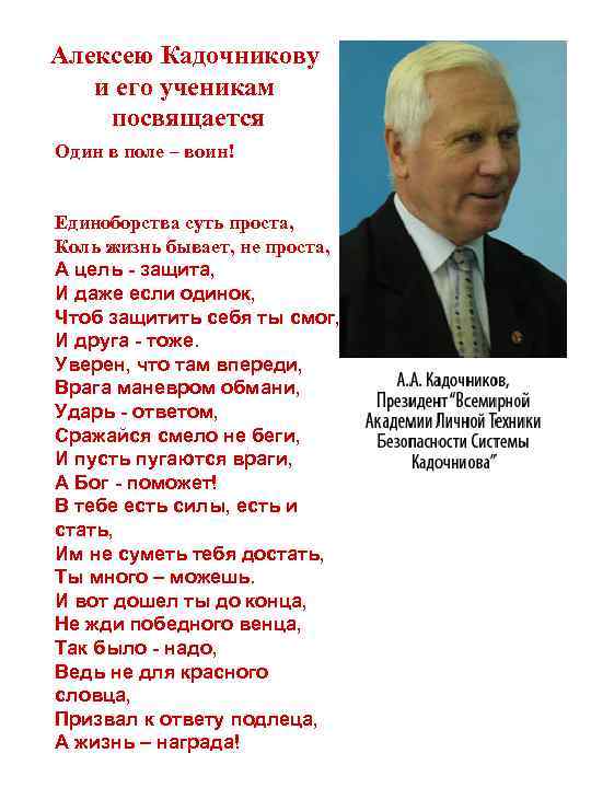 Алексею Кадочникову и его ученикам посвящается Один в поле – воин! Единоборства суть проста, Коль жизнь бывает, не проста, А цель - защита, И даже если одинок, Чтоб защитить себя ты смог, И друга - тоже. Уверен, что там впереди, Врага маневром обмани, Ударь - ответом, Сражайся смело не беги, И пусть пугаются враги, А Бог - поможет! В тебе есть силы, есть и стать, Им не суметь тебя достать, Ты много – можешь. И вот дошел ты до конца, Не жди победного венца, Так было - надо, Ведь не для красного словца, Призвал к ответу подлеца, А жизнь – награда!