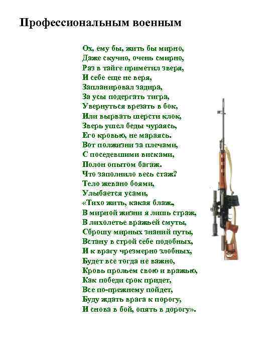 Профессиональным военным Ох, ему бы, жить бы мирно, Даже скучно, очень смирно, Раз в тайге приметил зверя, И себе еще не веря, Запланировал задира, За усы подергать тигра, Увернуться врезать в бок, Или вырвать шерсти клок, Зверь ушел беды чураясь, Его кровью, не мараясь. Вот полжизни за плечами, С поседевшими висками, Полон опытом багаж. Что заполнило весь стаж? Тело жевано боями, Улыбается усами, «Тихо жить, какая блаж. , В мирной жизни я лишь страж, В лихолетье вражьей смуты, Сброшу мирных знаний путы, Встану в строй себе подобных, И к врагу чрезмерно злобных, Будет все тогда не важно, Кровь прольем свою и вражью, Как победи срок придет, Все по-прежнему пойдет, Буду ждать врага к порогу, И снова в бой, опять в дорогу» .