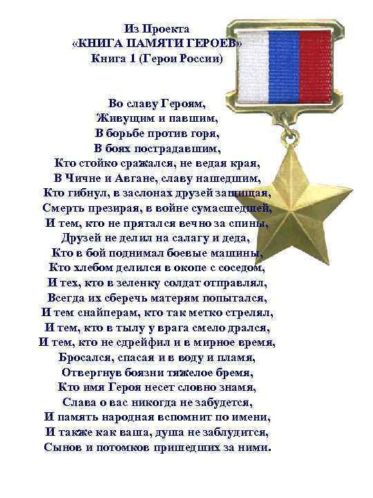 Из Проекта «КНИГА ПАМЯТИ ГЕРОЕВ» Книга 1 (Герои России) Во славу Героям, Живущим и павшим, В борьбе против горя, В боях пострадавшим, Кто стойко сражался, не ведая края, В Чичне и Авгане, славу нашедшим, Кто гибнул, в заслонах друзей защищая, Смерть презирая, в войне сумасшедшей, И тем, кто не прятался вечно за спины, Друзей не делил на салагу и деда, Кто в бой поднимал боевые машины, Кто хлебом делился в окопе с соседом, И тех, кто в зеленку солдат отправлял, Всегда их сберечь матерям попытался, И тем снайперам, кто так метко стрелял, И тем, кто в тылу у врага смело дрался, И тем, кто не сдрейфил и в мирное время, Бросался, спасая и в воду и пламя, Отвергнув боязни тяжелое бремя, Кто имя Героя несет словно знамя, Слава о вас никогда не забудется, И память народная вспомнит по имени, И также как ваша, душа не заблудится, Сынов и потомков пришедших за ними.