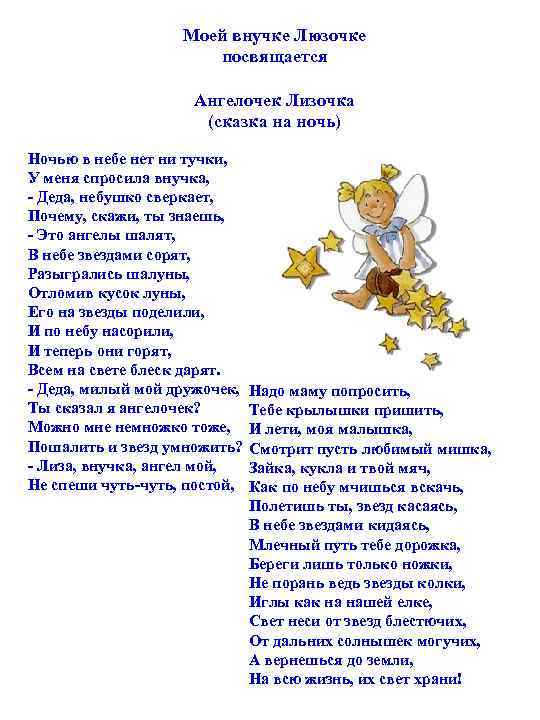 Моей внучке Люзочке посвящается Ангелочек Лизочка (сказка на ночь) Ночью в небе нет ни тучки, У меня спросила внучка, - Деда, небушко сверкает, Почему, скажи, ты знаешь, - Это ангелы шалят, В небе звездами сорят, Разыгрались шалуны, Отломив кусок луны, Его на звезды поделили, И по небу насорили, И теперь они горят, Всем на свете блеск дарят. - Деда, милый мой дружочек, Ты сказал я ангелочек? Можно мне немножко тоже, Пошалить и звезд умножить? - Лиза, внучка, ангел мой, Не спеши чуть-чуть, постой, Надо маму попросить, Тебе крылышки пришить, И лети, моя малышка, Смотрит пусть любимый мишка, Зайка, кукла и твой мяч, Как по небу мчишься вскачь, Полетишь ты, звезд касаясь, В небе звездами кидаясь, Млечный путь тебе дорожка, Береги лишь только ножки, Не порань ведь звезды колки, Иглы как на нашей елке, Свет неси от звезд блестючих, От дальних солнышек могучих, А вернешься до земли, На всю жизнь, их свет храни!