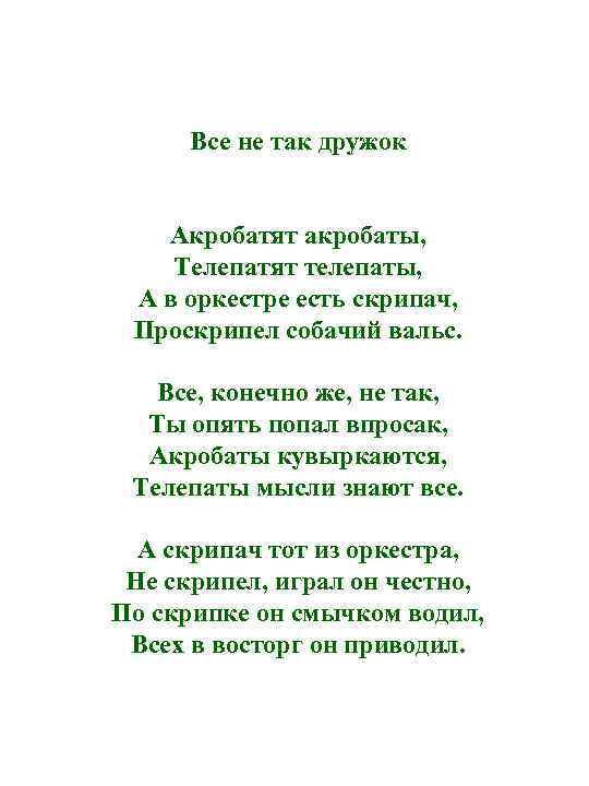Все не так дружок Акробатят акробаты, Телепатят телепаты, А в оркестре есть скрипач, Проскрипел собачий вальс. Все, конечно же, не так, Ты опять попал впросак, Акробаты кувыркаются, Телепаты мысли знают все. А скрипач тот из оркестра, Не скрипел, играл он честно, По скрипке он смычком водил, Всех в восторг он приводил.