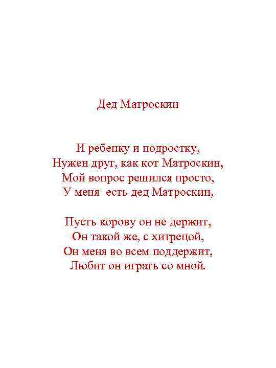 Дед Матроскин И ребенку и подростку, Нужен друг, как кот Матроскин, Мой вопрос решился просто, У меня есть дед Матроскин, Пусть корову он не держит, Он такой же, с хитрецой, Он меня во всем поддержит, Любит он играть со мной.