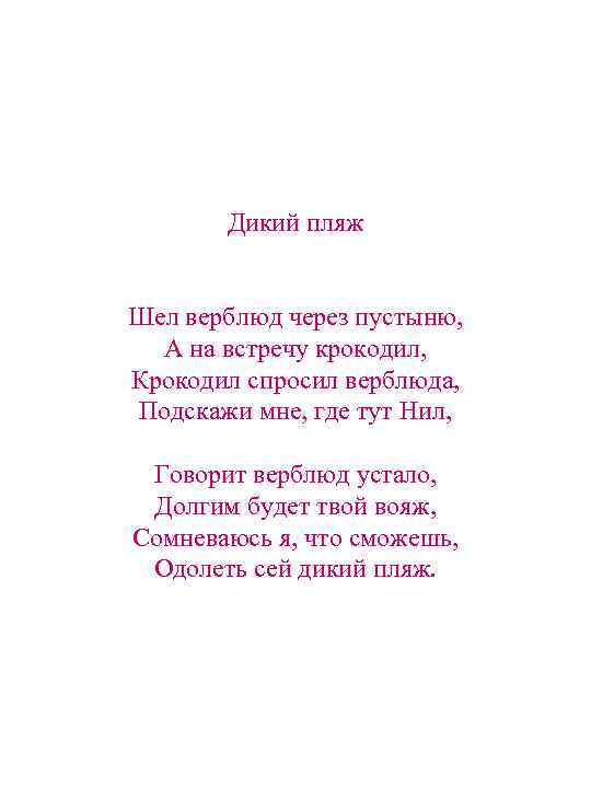 Дикий пляж Шел верблюд через пустыню, А на встречу крокодил, Крокодил спросил верблюда, Подскажи мне, где тут Нил, Говорит верблюд устало, Долгим будет твой вояж, Сомневаюсь я, что сможешь, Одолеть сей дикий пляж.