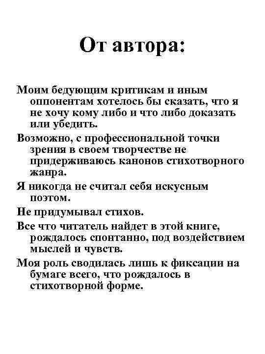 От автора: Моим бедующим критикам и иным оппонентам хотелось бы сказать, что я не хочу кому либо и что либо доказать или убедить. Возможно, с профессиональной точки зрения в своем творчестве не придерживаюсь канонов стихотворного жанра. Я никогда не считал себя искусным поэтом. Не придумывал стихов. Все что читатель найдет в этой книге, рождалось спонтанно, под воздействием мыслей и чувств. Моя роль сводилась лишь к фиксации на бумаге всего, что рождалось в стихотворной форме.