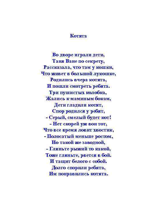 Котята Во дворе играли дети, Таня Ване по секрету, Рассказала, что там у кошки, Что живет в большой лукошке, Родились вчера котята, И пошли смотреть ребята. Три пушистых колобка, Жались к маминым бокам, Дети гладили котят, Спор родился у ребят, - Серый, смелый будет кот! - Нет скорей уж вон тот, Что все время ловит хвостик, - Полосатый меньше ростом, Но такой же заводной, - Гляньте рыжий то какой, Тоже гляньте, рвется в бой. И тащит белого с собой. Долго спорили ребята, Им понравились котята.