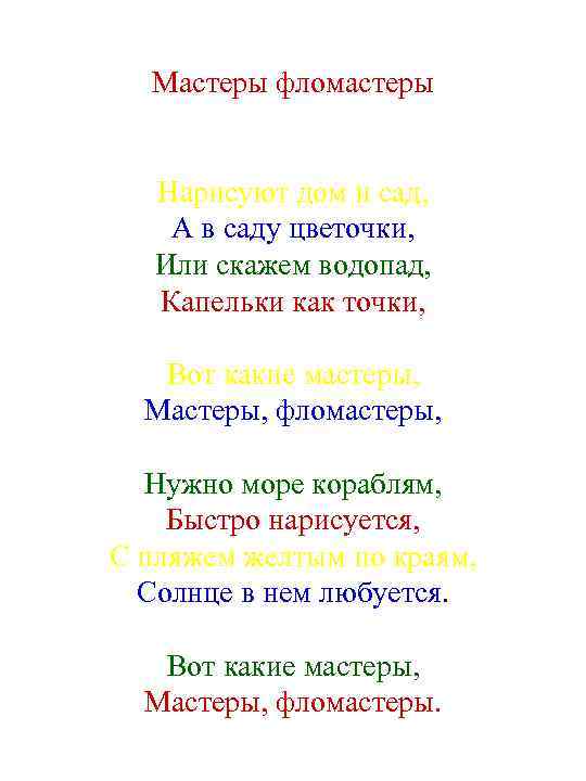 Мастеры фломастеры Нарисуют дом и сад, А в саду цветочки, Или скажем водопад, Капельки как точки, Вот какие мастеры, Мастеры, фломастеры, Нужно море кораблям, Быстро нарисуется, С пляжем желтым по краям, Солнце в нем любуется. Вот какие мастеры, Мастеры, фломастеры.