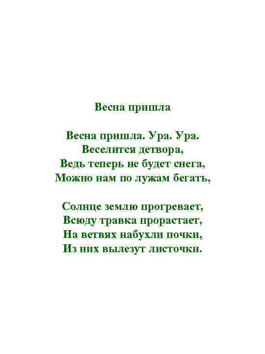 Весна пришла. Ура. Веселится детвора, Ведь теперь не будет снега, Можно нам по лужам бегать, Солнце землю прогревает, Всюду травка прорастает, На ветвях набухли почки, Из них вылезут листочки.